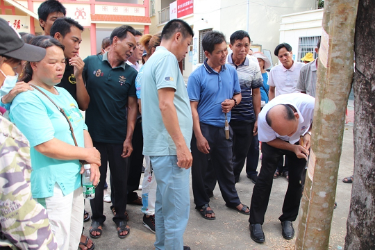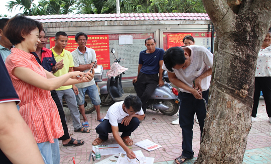 為了檢驗膠農一天來的割膠技術成績和收獲, 當天下午, 還對膠農中線、低線和陰線割膠技術進行實操測試。