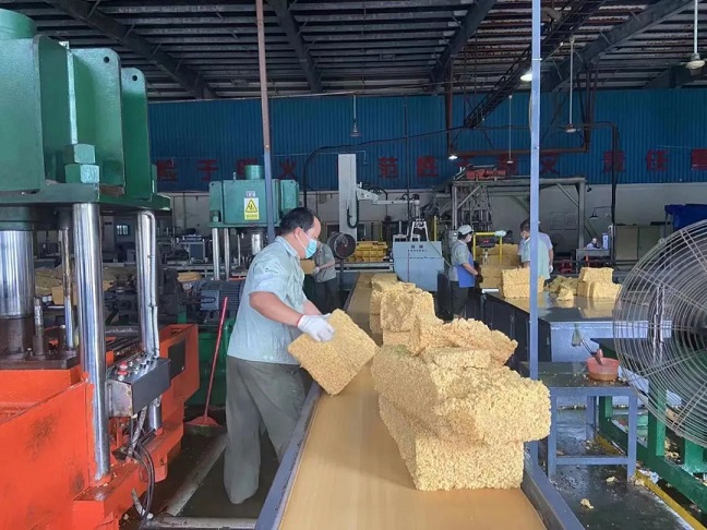 金隆橡膠加工分公司包裝車間正抓緊全乳膠的產品包裝生產。