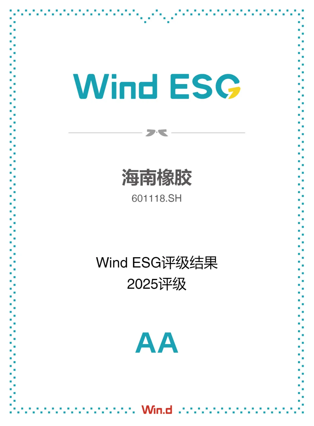 2025年6月,Wind ESG(萬得信息推出的環(huán)境、社會和公司治理評級體系)最新評級數(shù)據(jù)顯示,海南橡膠Wind ESG評級由A級上調(diào)至AA級,綜合得分排名位列所在紙與林業(yè)產(chǎn)品行業(yè)首位。